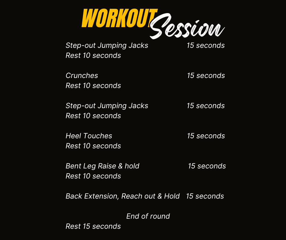 To maximize your results, it is recommended that you follow a circuit training-style workout regimen. This means you will perform the first exercise for 15 seconds, and rest for a length of 10 seconds before performing the next exercise. Continue this until you have completed all six exercises.